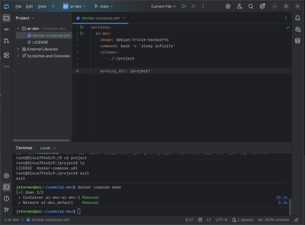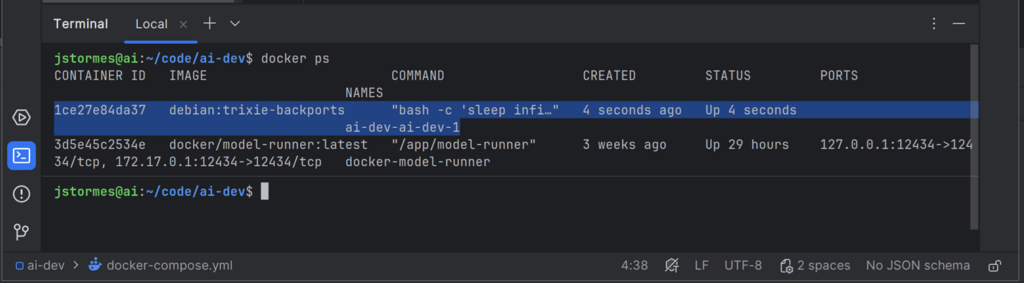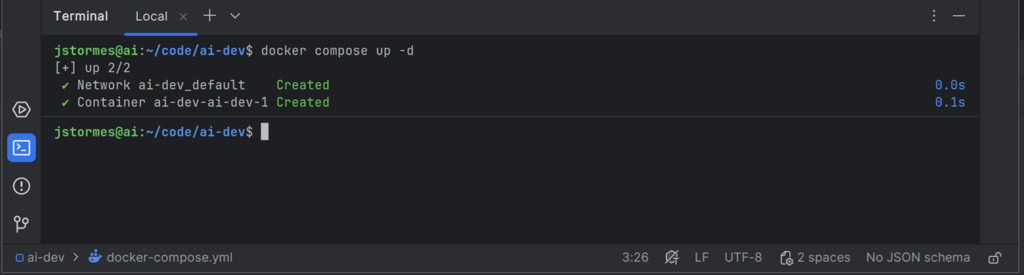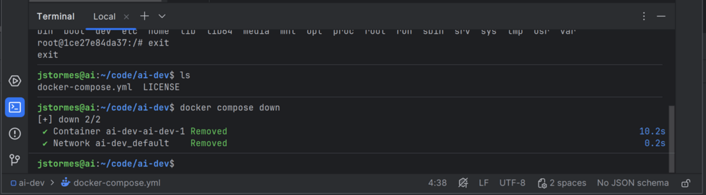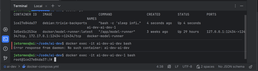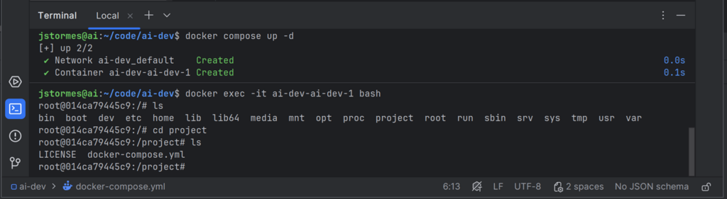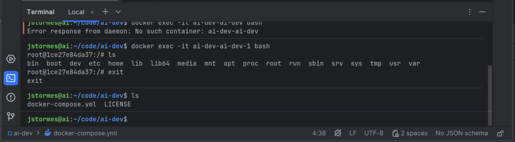 We can start our container again with docker compose up -d and go “inside” with docker exec -it ai-dev-ai-dev-1 bash.