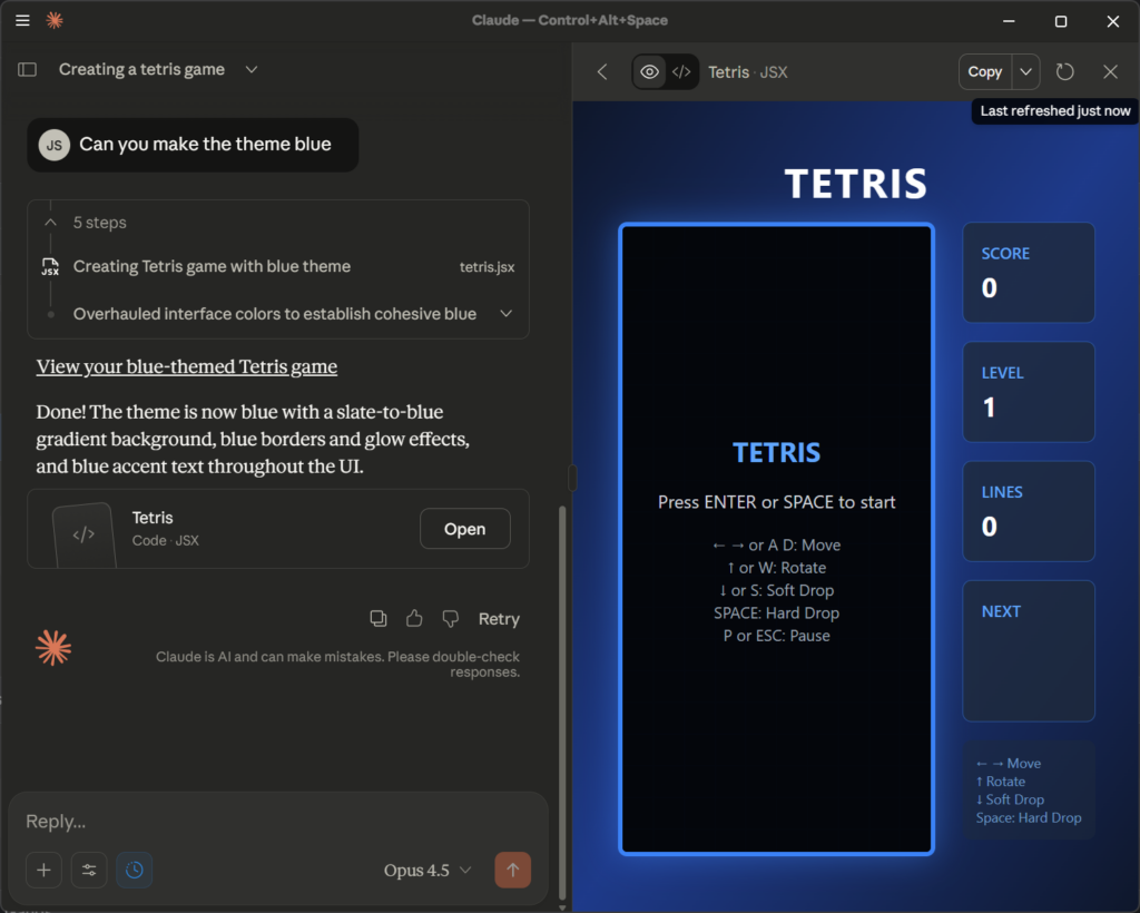 Prompt given to Claude: “Can you create a Tetris game for me”