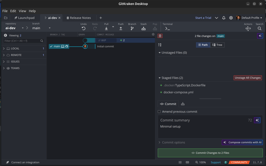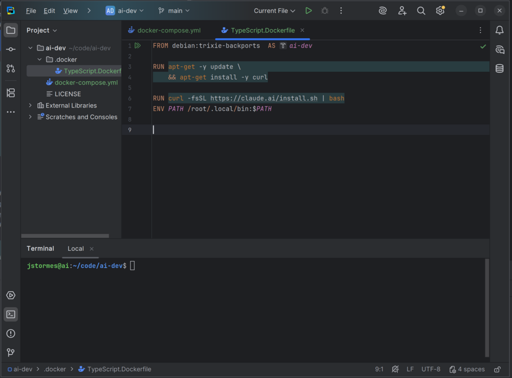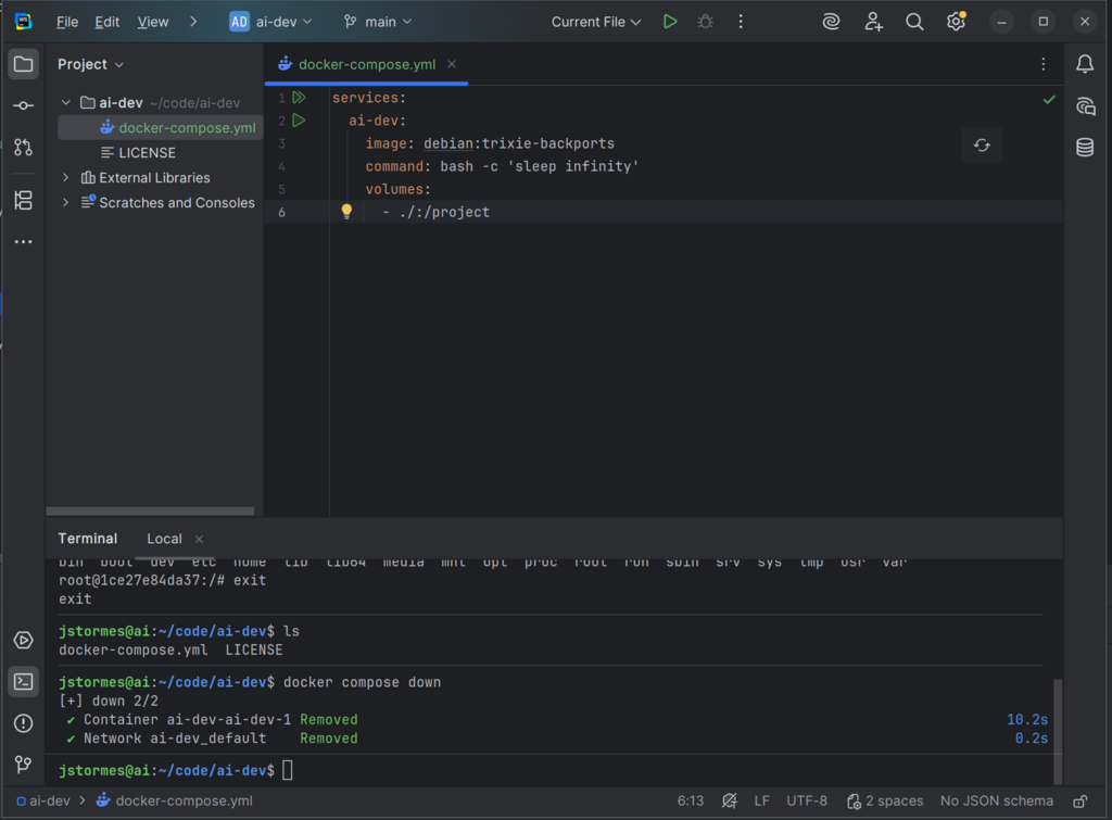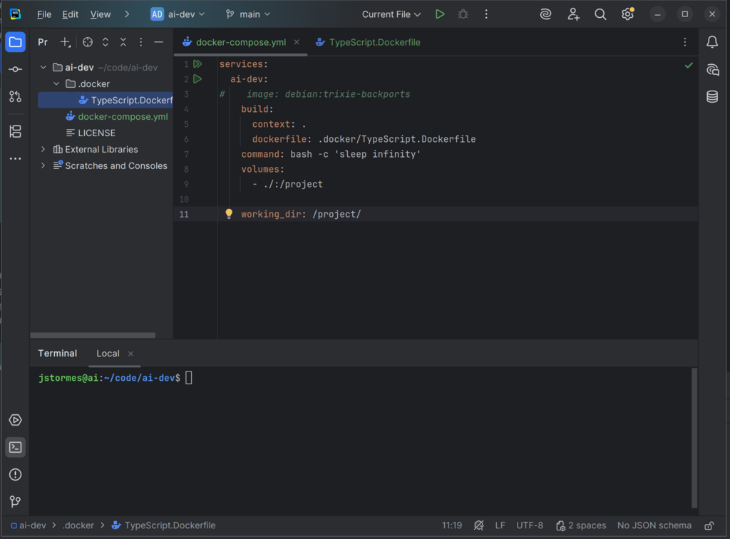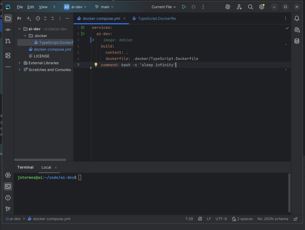 In that file add the line FROM debian AS ai-dev. This tells Docker to use the same Debian-based image that we are using in the docker-compose.yml file.
