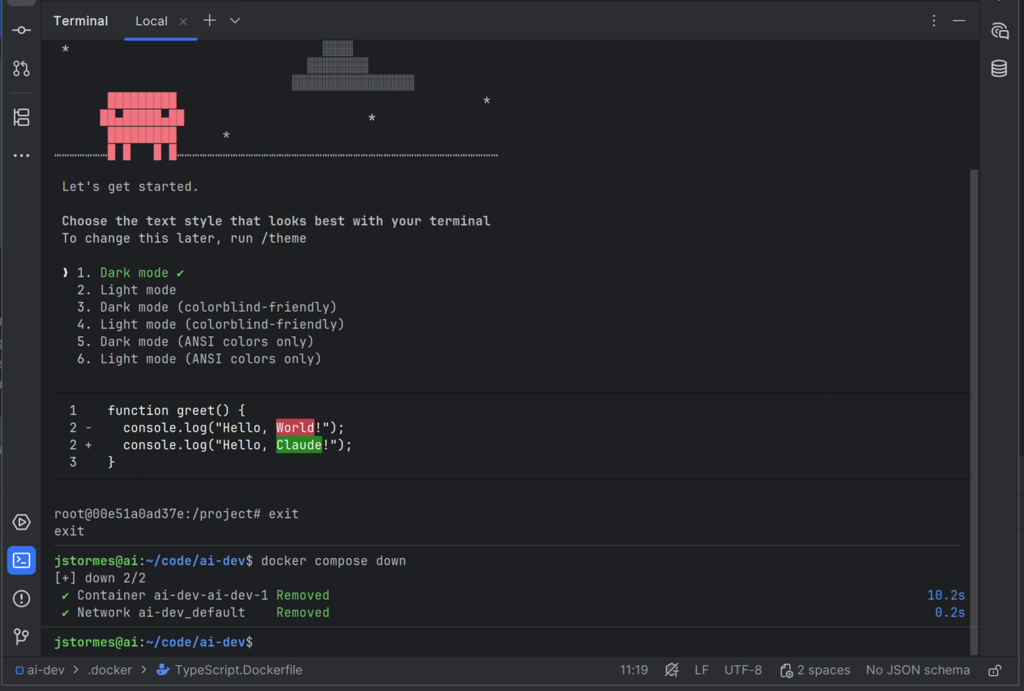 Press Ctrl+C to exit Claude, then type exit followed by docker compose down to clean up.