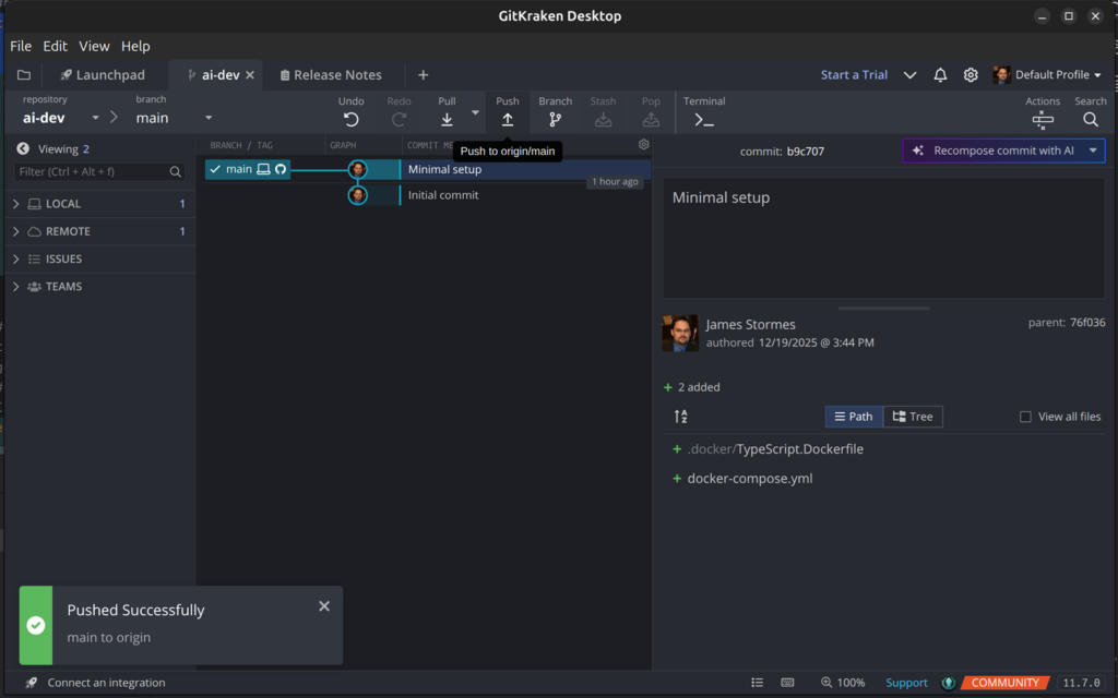 Now we run docker compose build to build our new image, followed by docker compose up -d and docker exec -it ai-dev-ai-dev-1 bash. We can now run claude inside our container.